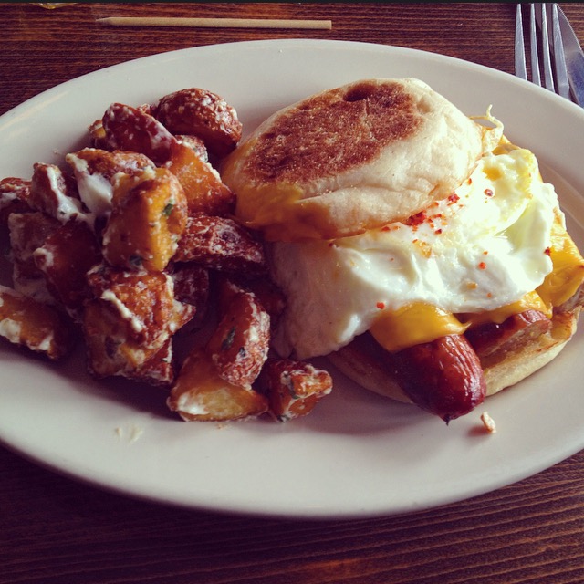 I ordered “The Buddy,” because it seemed like the easiest meal to make gluten free by just not eating the english muffin. I was also very intrigured by the chevre (goat cheese) potatoes, which were my favorite part of the meal by far. The chevre on the potatoes almost made them taste like they had parmesan on them and I’ve never had a parmesan food I haven’t liked.
