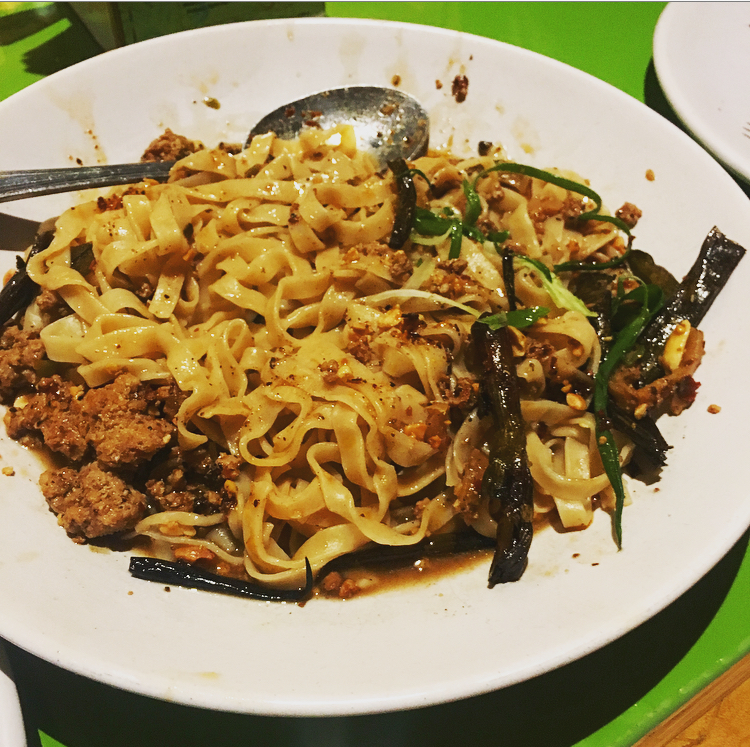 Dan Dan Noodles: Egg Noodles, spicy pork, chives, and peanuts