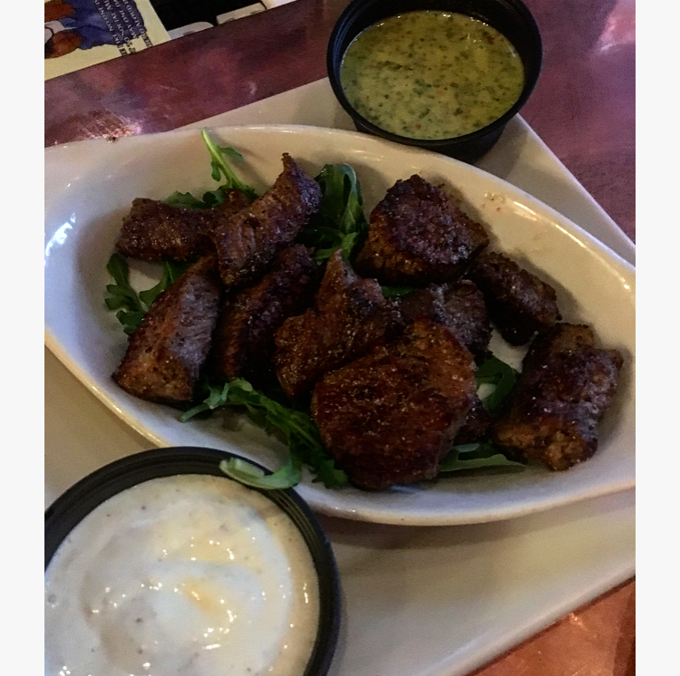 Cast Iron Steak Bites: Hand cut steak, garlic pepper, dijon horseradish, and chimchurri