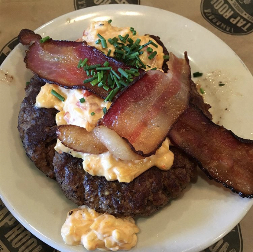 Pimento Bacon Cheeseburger: Beef with blend of pimento, cream cheese, pepperjack, and cheddar with bacon