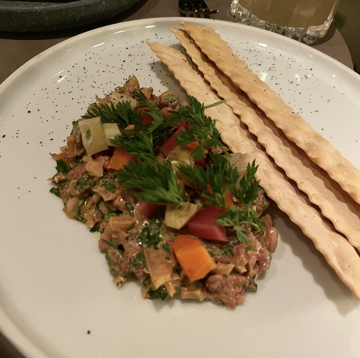 Lamb Tartare: Ras El Hanout, “A La Grecque” Vegetables, Lemon Omani, Red Lentil Cracker