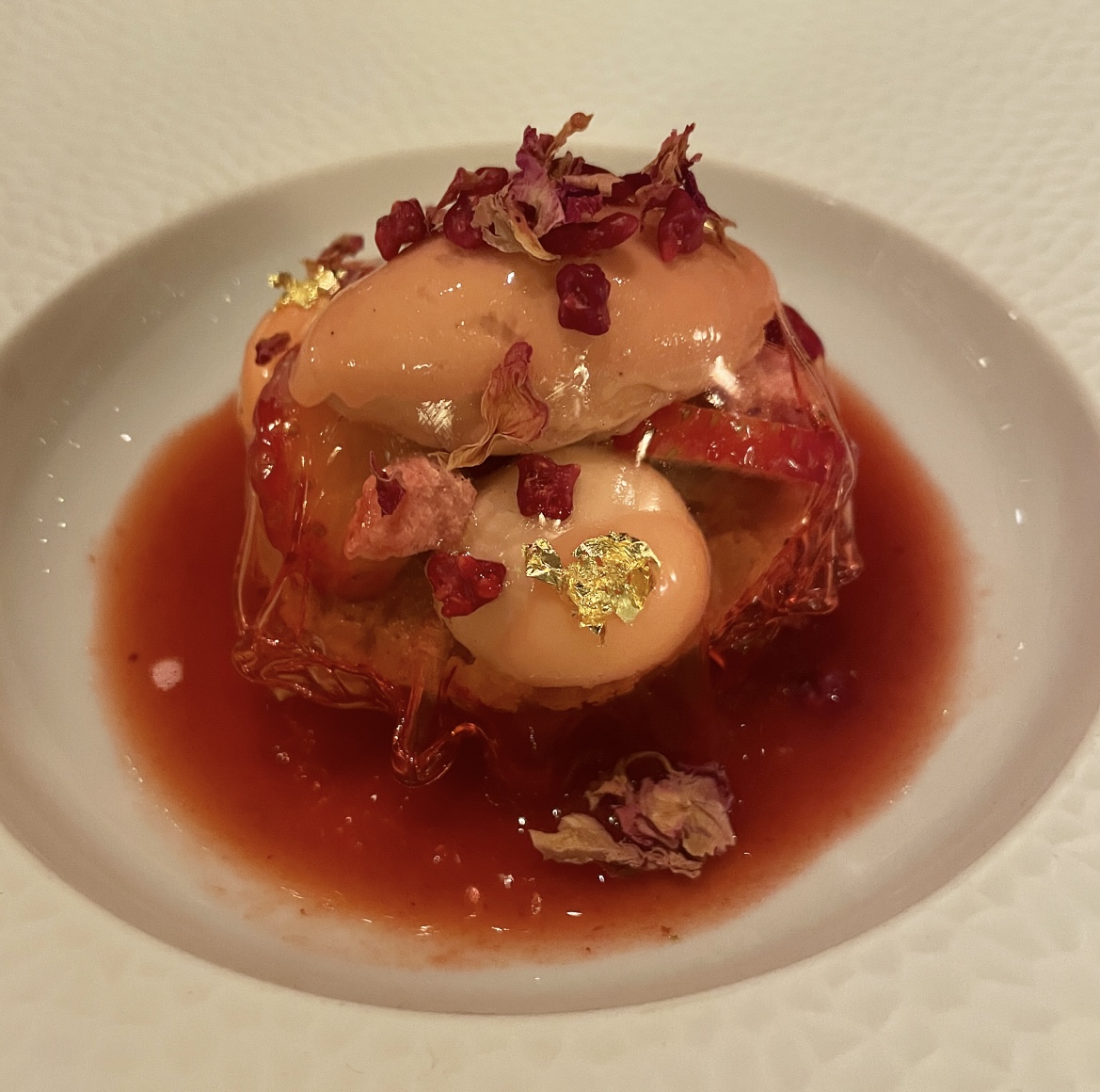 Rose: Ruby Chocolate Sponge Cake, Roasted Strawberry, Vanilla Yogurt, Rose Veil and Rose Strawberry Consommé