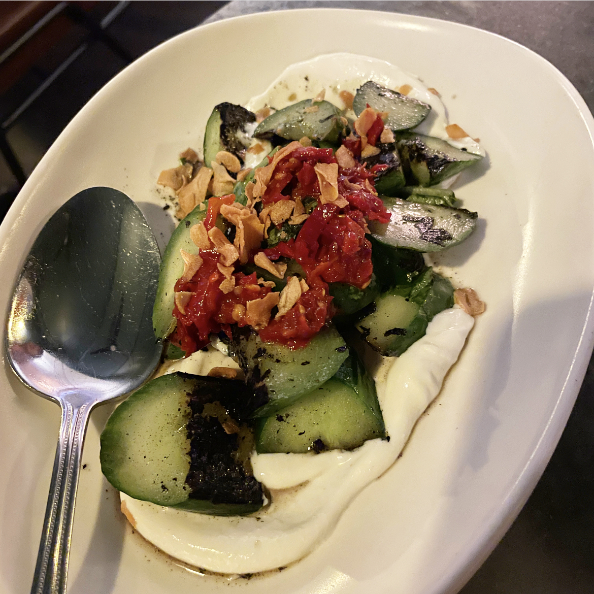 Charred Cucumbers: Whipped ricotta, calabrian chilies, crispy garlic