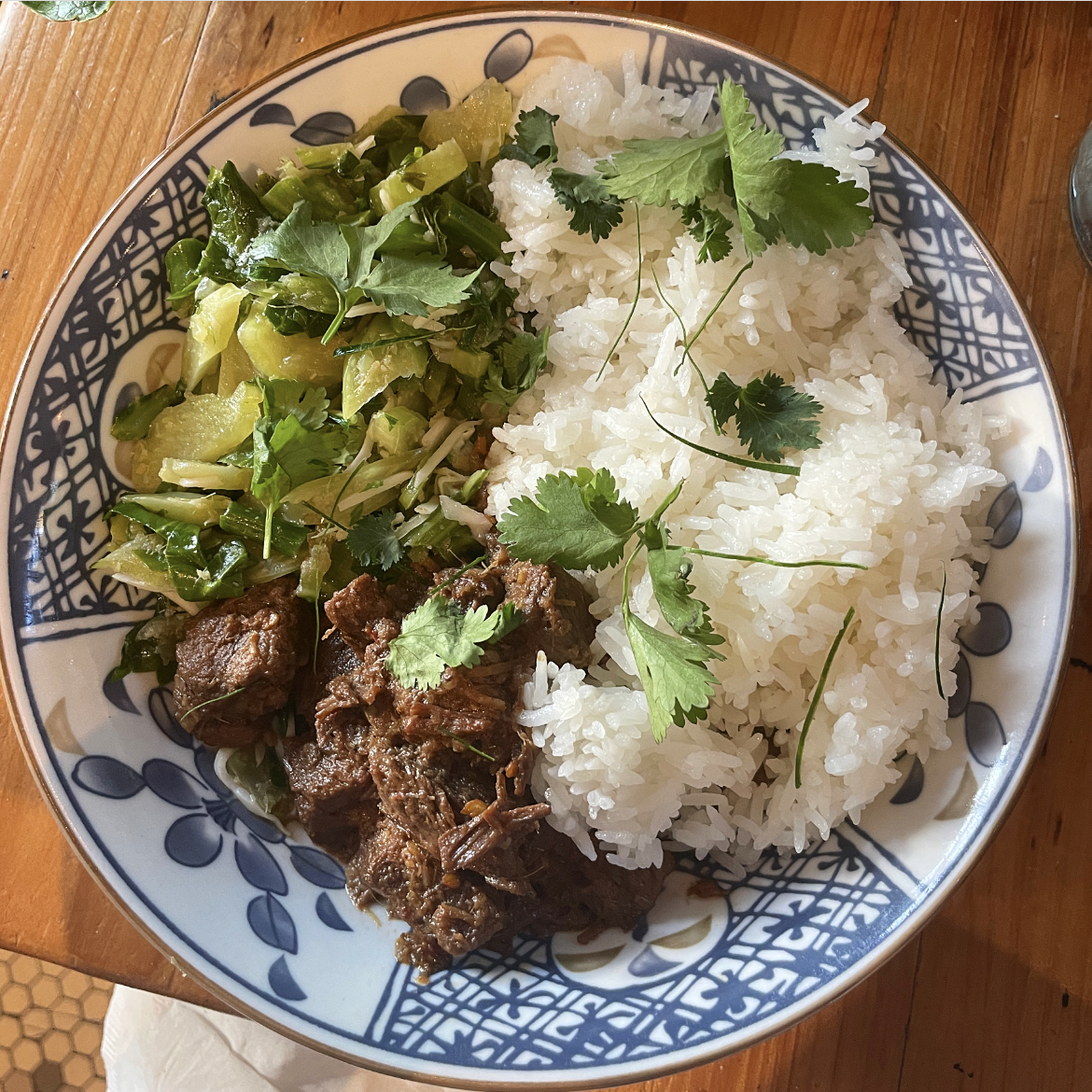 Beef Rendang: Beef slow cooked in dry curry with rich spices, coconut cream, tamarind and lemongrass, served with coconut rice and califlower greens urap