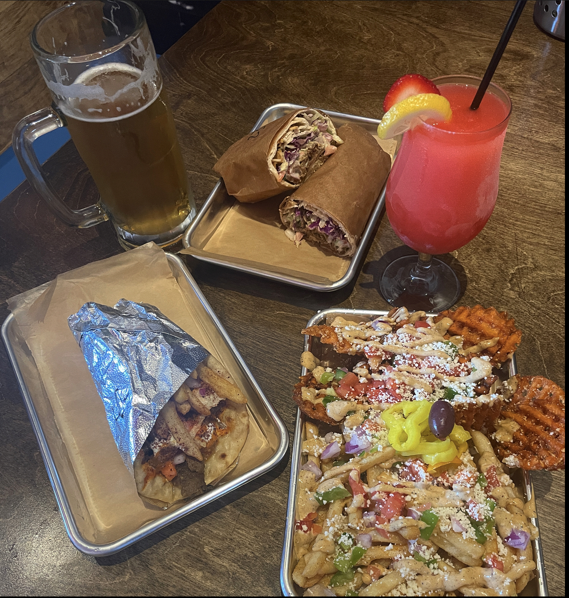 The Gyro: Zesty feta spread, Berliner Sauce, tzatziki, onion, tomato and fries inside with beef and lamb