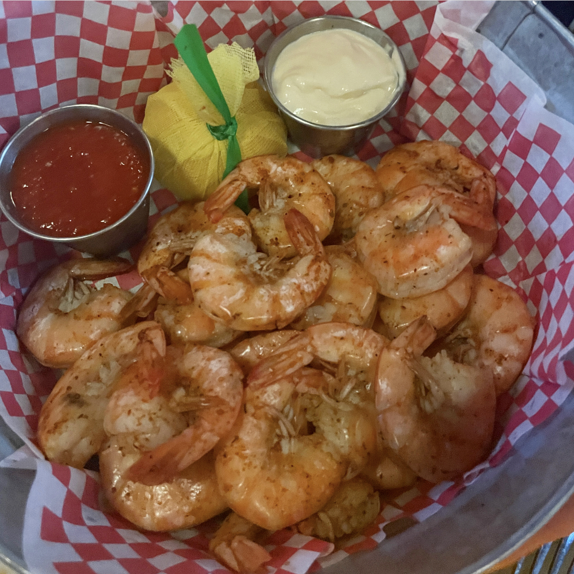 Peel & Eat Shrimp: 1LB Boiled Cajun Shrimp, Cocktail Sauce, Ginger Mustard Aioli