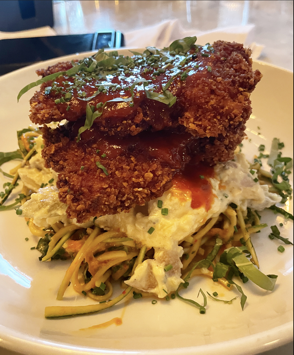 Fried BBQ Piri Chicken: Amish chicken thighs potato salad, zucchini, chorizo