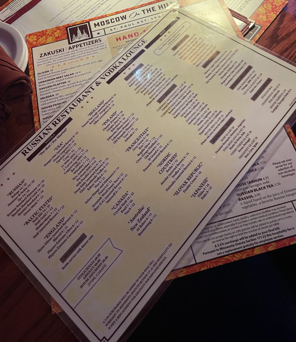 As a vodka enthusiast, I’m embarrassed to say this is only my second time visiting Moscow on the Hill in Saint Paul 😬. Lately husband and I have been stuck in a bit of a rut so when he told me it was my turn to pick date night I put together a list of places I was long overdue for a visit and when he saw Moscow on the Hill and he realized he could get some quality “beef strogo” it was an immediate yes for him.