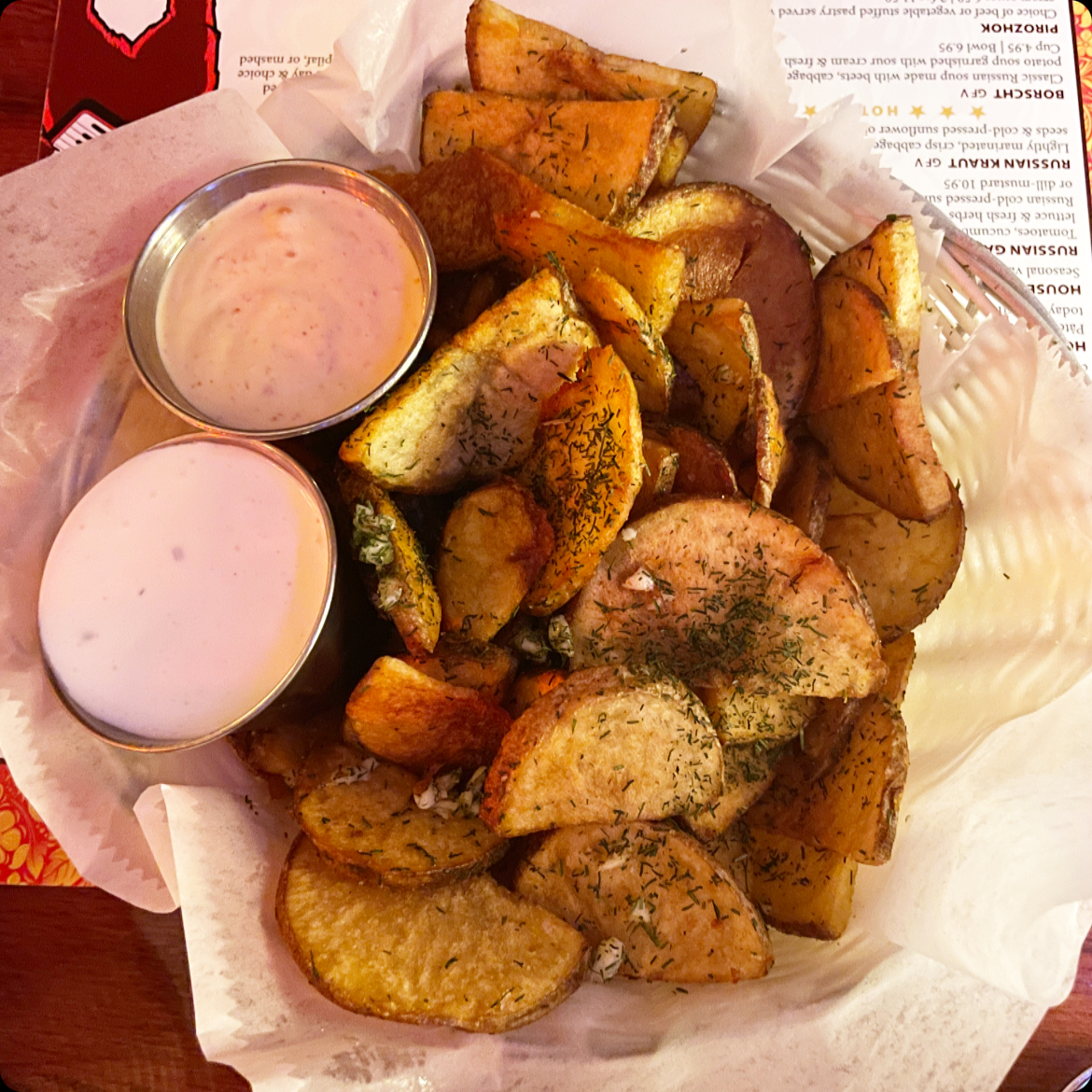 Moscow Fries: House cut fries tossed in dill and fresh garlic served with dipping sauces