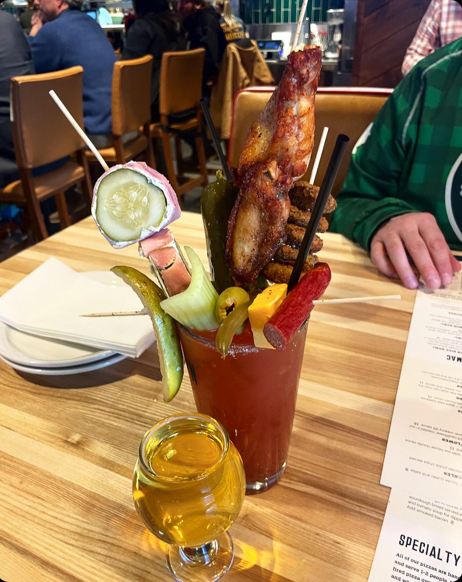 The Big Dill Bloody Mary: Dill infused vodka, a giant pickle, two pickle dry rubbed wings, Minnesota sushi, and dill fried pickles