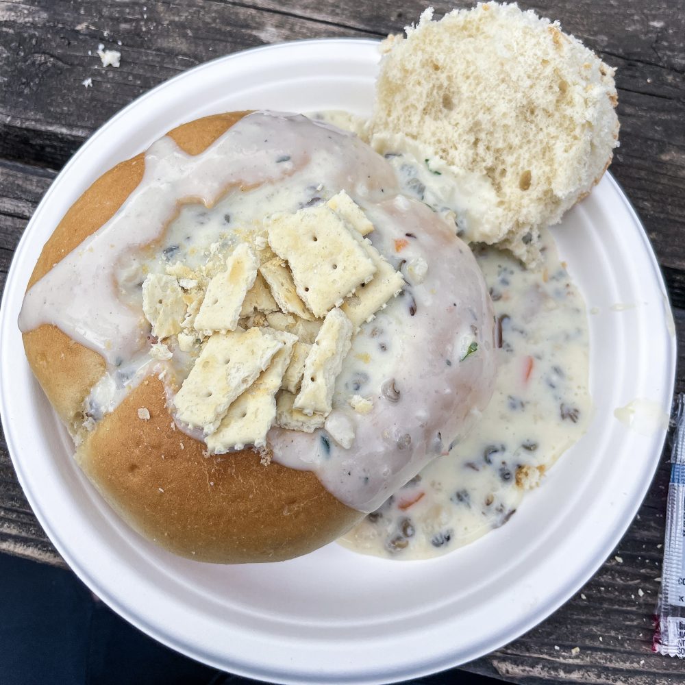 I grew up eating bread bowl soup at RenFest. My mom used to take us as kids and we got to pick out our own lunches and I ALWAYS picked bread bowl soup. Yum.