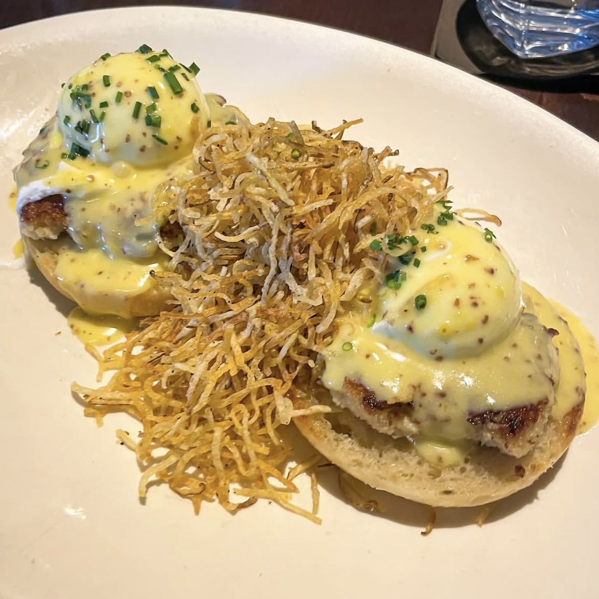 Crab Cake Benedict: Jumbo lump crab cakes, poached eggs, toasted English muffin,