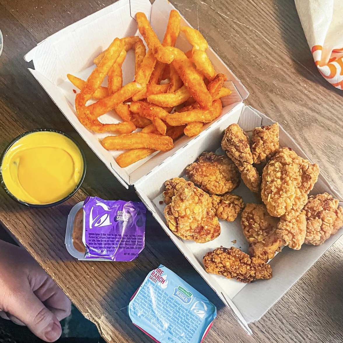 Crispy Chicken Bites: Premium all-white meat crispy chicken, marinated with bold Mexican spices, and tossed in a crunchy tortilla chip coating. Served with Fire Ranch sauce.
